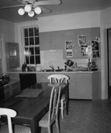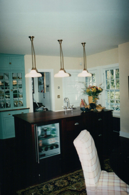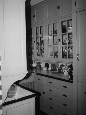 With storage requirements met by the existing butler’s pantry, little cabinetry was built in the kitchen proper. Blue-green painted cabinetry next to the range was custom-built to match the butler’s pantry, including copper edging on countertops covered in white laminate for a more durable version of original painted wood countertops. A deceptive mahogany island hides appliances like dishwasher-, refrigerator- and freezer-drawers.