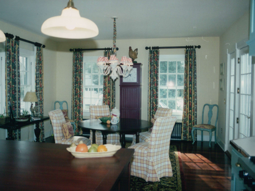 A high ceiling with chandelier, draped windows with a panoramic view, a glass door leading to a brick patio—all centered around a turned leg wooden table. The room has all the trappings of an elegant dining room except that, steps away, dinner is simmering on the stove.