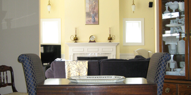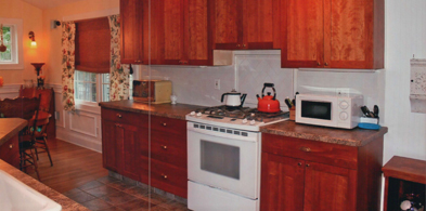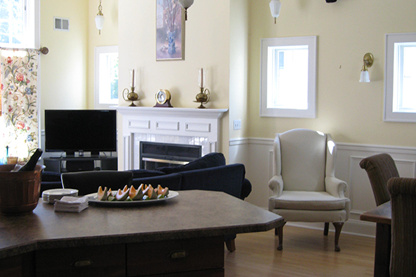 For one, it allowed me to make the fireplace the focal point of not only the family room but the adjoining living room as well. I located the fireplace at the end of the living room’s extended long axis, thereby creating a view from front to back, old into new. Under the lower pitched ceiling of the family room, a dining table sits near the kitchen whose back wall was blown out to connect it both visually and physically to the new room. Essentially, the renovated kitchen functions as a cozy alcove off one corner of the family room. For more elbow room in the kitchen, I extended a bank of its cabinetry into the addition and installed a breakfast bar whose advancing angle gives the distinct impression that it’s rounding the corner to make its way into the family room.