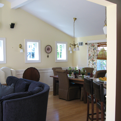 So besides showing my clients a sketch of the duly expected gabled wing glommed onto the back of their house, I showed them a livelier alternative. The tall room with an asymmetrically pitched roofline on the outside was inspired by a barn I admired in a painting that hung in my parents’ entry hall. With a little coaxing, I convinced my clients that, not only was a little barn that sidled up to their house a better response to their corner lot on the outside, the saltbox profile would yield dramatic results inside.