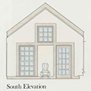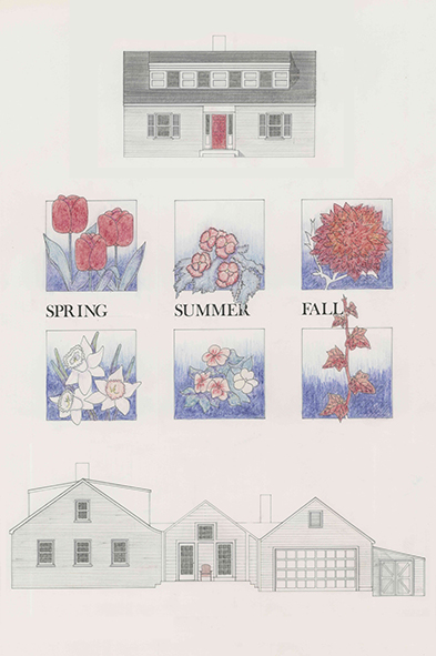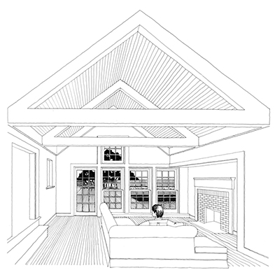 When asked by the new owners to re-imagine the humdrum family room, I played against type by replacing the breezeway section with a street-facing gabled room that effectively gave the house its distinctive sawtooth profile on the outside. A generous coat of whitewash unified a mishmash of siding materials while making certain that the house fit in with its predominantly white-painted neighbors. A distinctive red front door and an unexpected pink chair at the side door punctuate the white on white scheme while underpinning the palette for newly-dug flower beds chosen by the homeowners with my help.