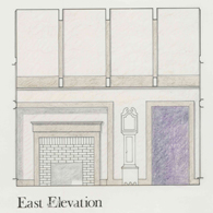 Inside, a cathedral ceiling made way for stacked windows on the gable ends that provide views through the house to the garden out back. The underside of the roof decking is exposed and horizontal beams suspend track lighting while maintaining what would have been the plane of a conventional flat ceiling. Subtle asymmetry in the floor plan offered an opportunity for a shallow bay with bookshelves and coat closet; the bay was carved away to create an alcove for the redressed fireplace and its iconic swan.