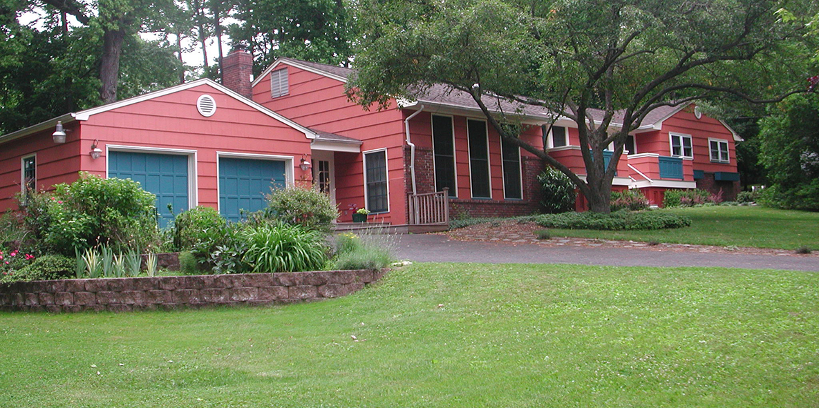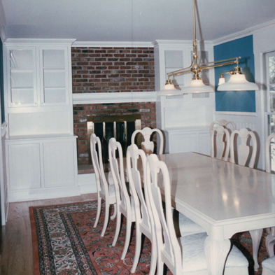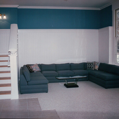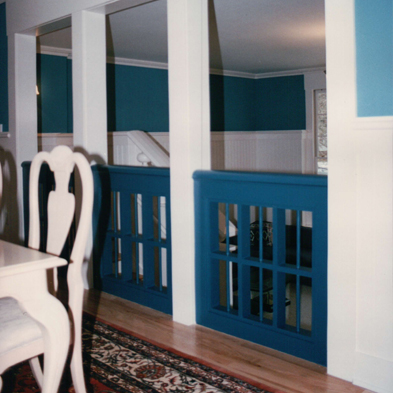 Later, a project I had proposed as part of a master plan came to be as a new deck across the front of the house that eliminated the former front stoop. As part of that second stage, I added architectural detail to the family room that occupied the space of the former living room.