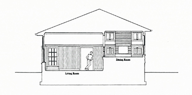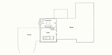 In order to convert the garage into a living room, I designed a new wing for a garage, entry foyer and powder room. My suggestion to forget about room names freed our minds to convert the family room into a dining room and reassign the living room to become a family room.